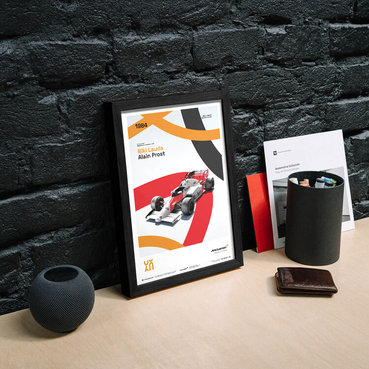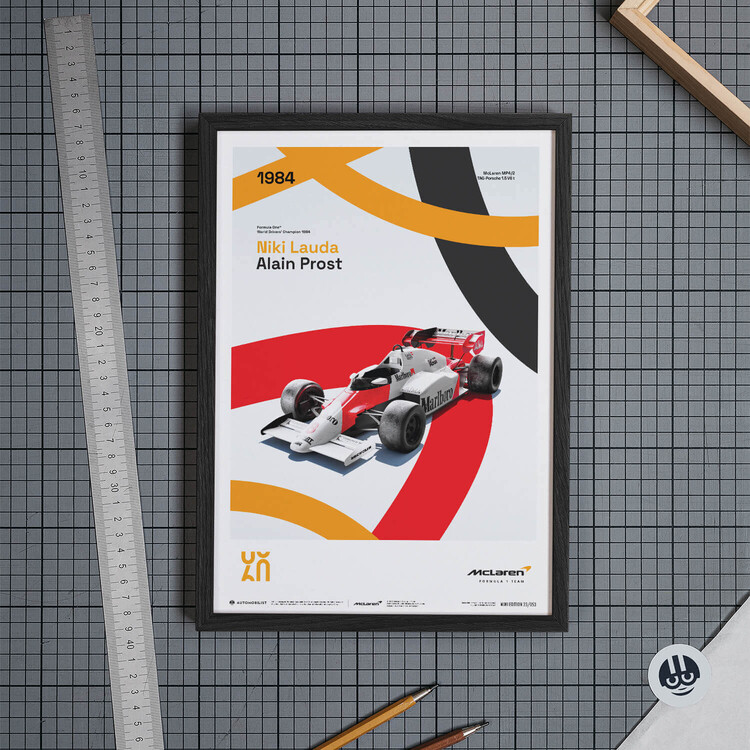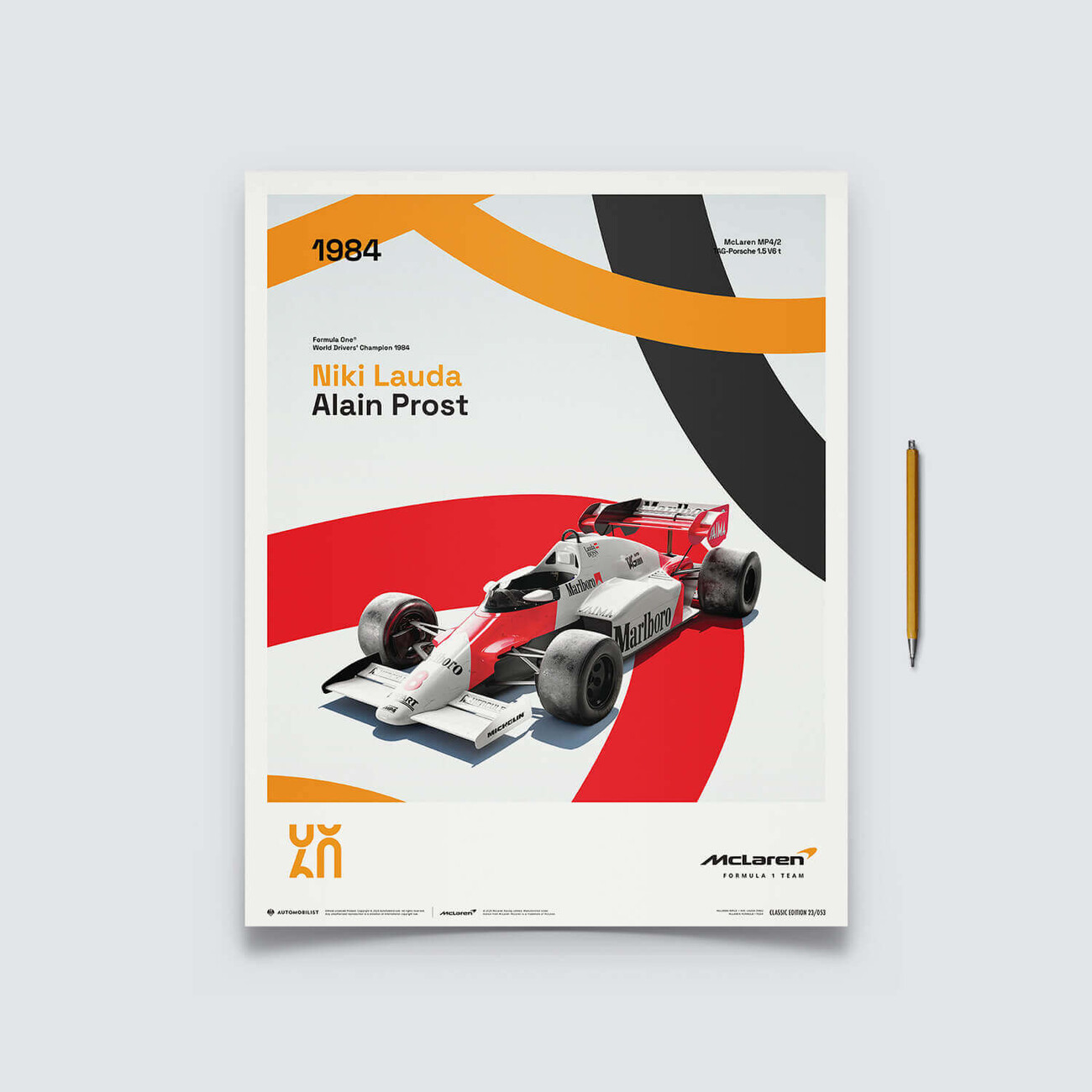Step into the world of McLaren's legendary racing legacy with our latest poster featuring the iconic McLaren MP4/2. Designed by John Barnard, this ground-breaking carbon-fibre monocoque chassis marked McLaren's triumphant return as a Grand Prix-winning team in the early 1980s. Its sleek and aerodynamic design propelled the McLaren MP4/2 to greatness, all the while the TAG-Porsche engine unleashed unprecedented power, allowing it to dominate the Formula 1 circuit. Witness the impressive downforce generated by the 'barn-door' wings, as Alain Prost and Niki Lauda piloted the MP4/2 to a staggering 12 wins out of 16 races in the 1984 season.