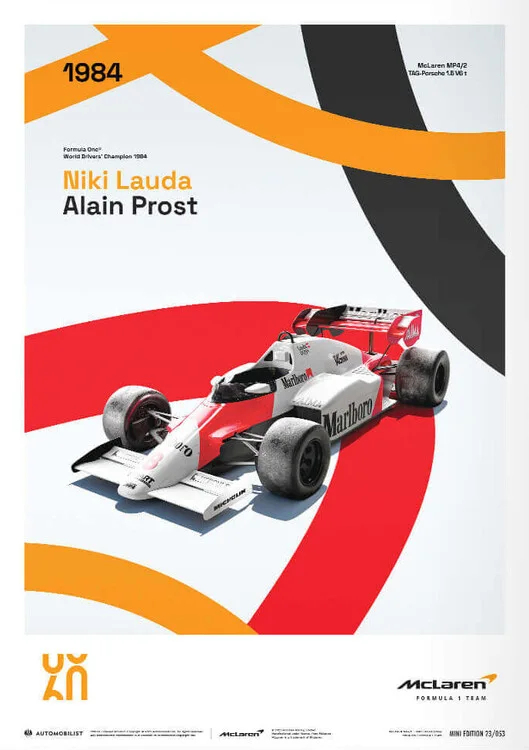 Ikonický McLaren MP4/2 se vrací na plakát v rámci série legendárních vozů. John Barnard jej navrhl s karbonovým monokokem a motorem TAG-Porsche, což přineslo McLarenu návrat mezi vítěze. V roce 1984 s ním Alain Prost a Niki Lauda vyhráli 12 z 16 závodů, podpořeni obrovským přítlakem „barn-door“ křídel. Tento monopost se stal symbolem dominance 80. let.