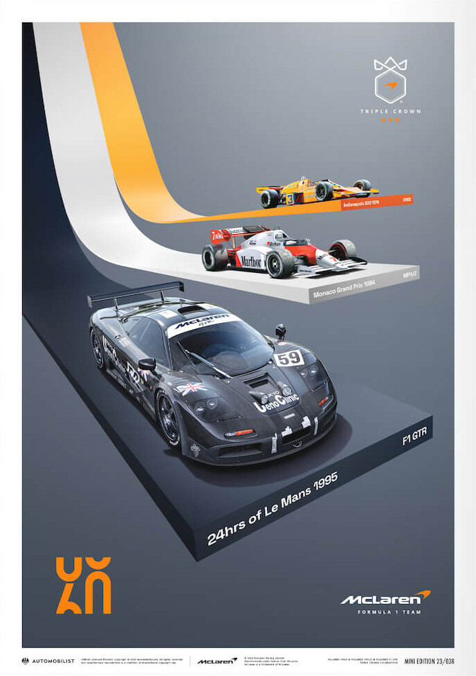 Není tajemstvím, že letos McLaren slaví 60 let od svého založení Bruce McLarenem. Od ikonických silničních vozů po legendární úspěchy v motorsportu – mezi všemi trofejemi vyniká jedna nejvíc: Triple Crown of Motorsports. Vyhrát tři nejprestižnější závody světa – Indianapolis 500, Velkou cenu Monaka a 24 hodin Le Mans – je úspěch, který nemá obdoby. A my jsme nadšení, že se můžeme k oslavám připojit! Příběh McLaren Racing sahá do roku 1974, kdy tým vyhrál Indianapolis 500 s vozem M16D a pilotem Johnnym Rutherfordem. O deset let později následovala druhá koruna v Monaku díky Alainu Prostovi a legendárnímu MP4/2. Třetí triumf přišel v roce 1995, kdy McLaren F1 GTR při své první účasti šokoval svět vítězstvím v Le Mans. Čtyři ze sedmi vozů se tehdy umístily v první pětce – dokonalé završení snu o Triple Crown. Naše speciální plakátová edice zachycuje všechny tři vítězné vozy na pomyslném podstavci, který slouží i jako časová osa jejich úspěchů. V McLaren barvách, s autentickými detaily od opotřebovaných pneumatik po zašpiněnou karoserii, působí jako právě doražené do cíle.
