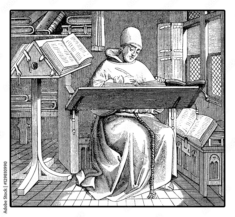 Fotografie Medieval monk copying an ancient manuscript, vintage engraving
