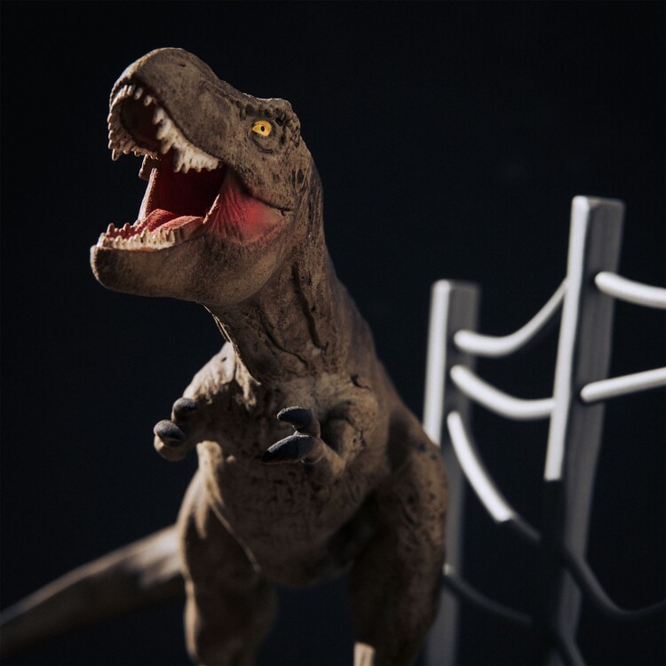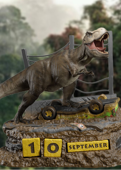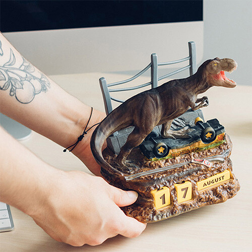 Stylový věčný 3D kalendář inspirovaný Jurským parkem je ručně malovaný a vyrobený z odolné pryskyřice. Má kompaktní rozměry 15 x 15 x 21 cm.