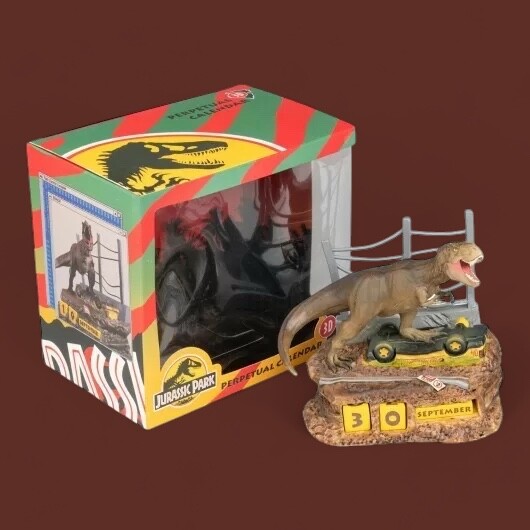 Věčný 3D kalendář inspirovaný Jurským parkem je praktickým i stylovým doplňkem pro fanoušky této filmové série. Vyrobený je z odolné pryskyřice a ručně malovaný v autentických barvách Isla Nublar. Obsahuje pět vyměnitelných bloků pro dny a měsíce, které umožňují sestavit všechna data roku. Díky kompaktním rozměrům 15 x 15 x 21 cm je ideální na pracovní stůl nebo jako sběratelský kousek. Je také perfektním dárkem pro milovníky dinosaurů.
