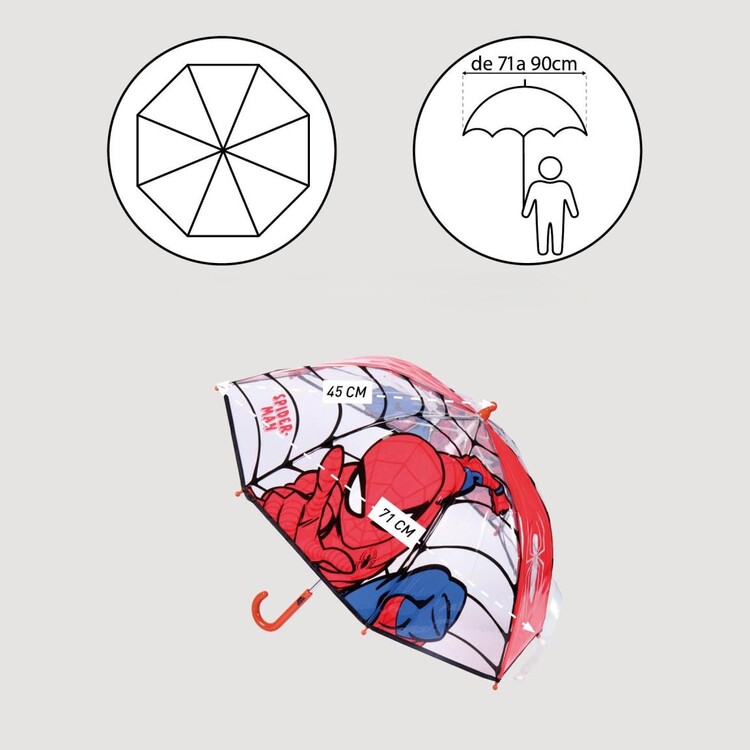 Deštník s motivem Spidermana potěší každého malého hrdinu! Díky kompaktní velikosti a lehké konstrukci perfektně padne i do drobných rukou. Průhledné části navíc zajistí, že malý hrdina bude mít vždy skvělý rozhled. Pevná kostra z odolného sklolaminátu spolu s jednoduchým manuálním otevíráním zaručují snadné a spolehlivé používání.