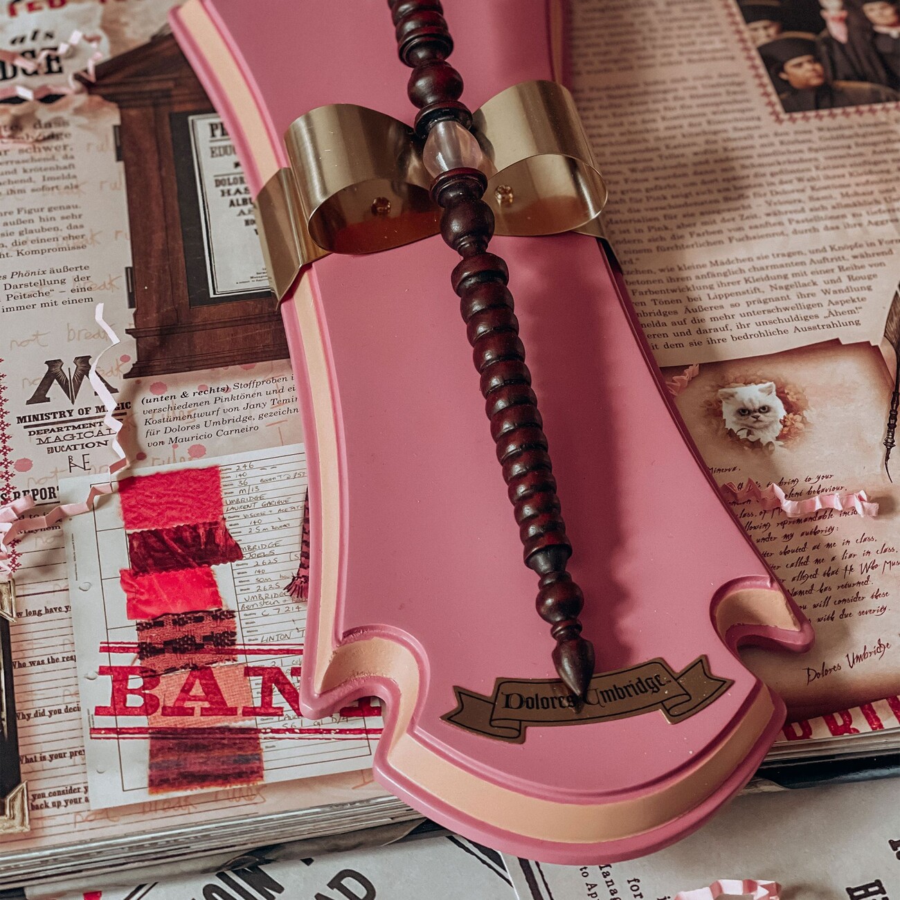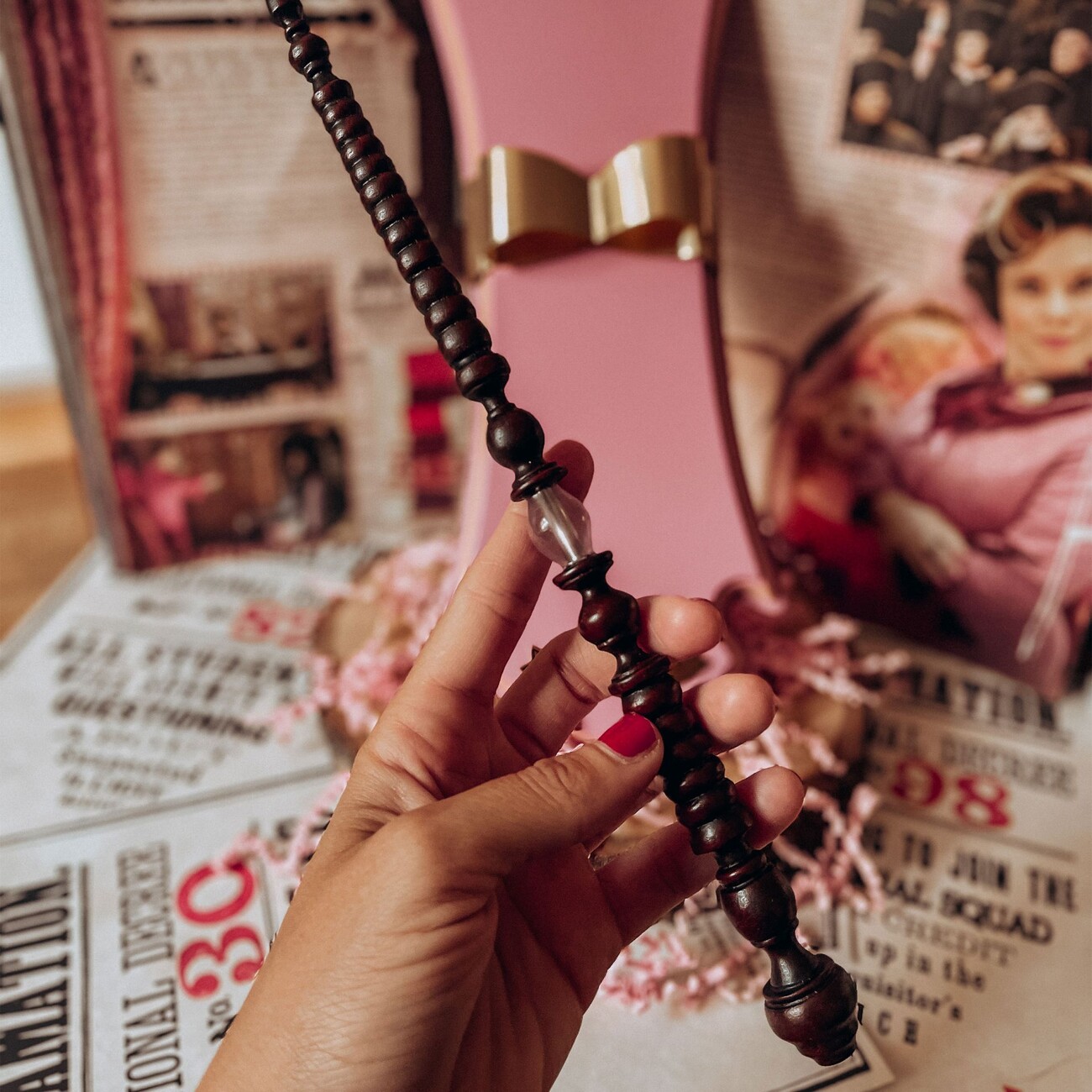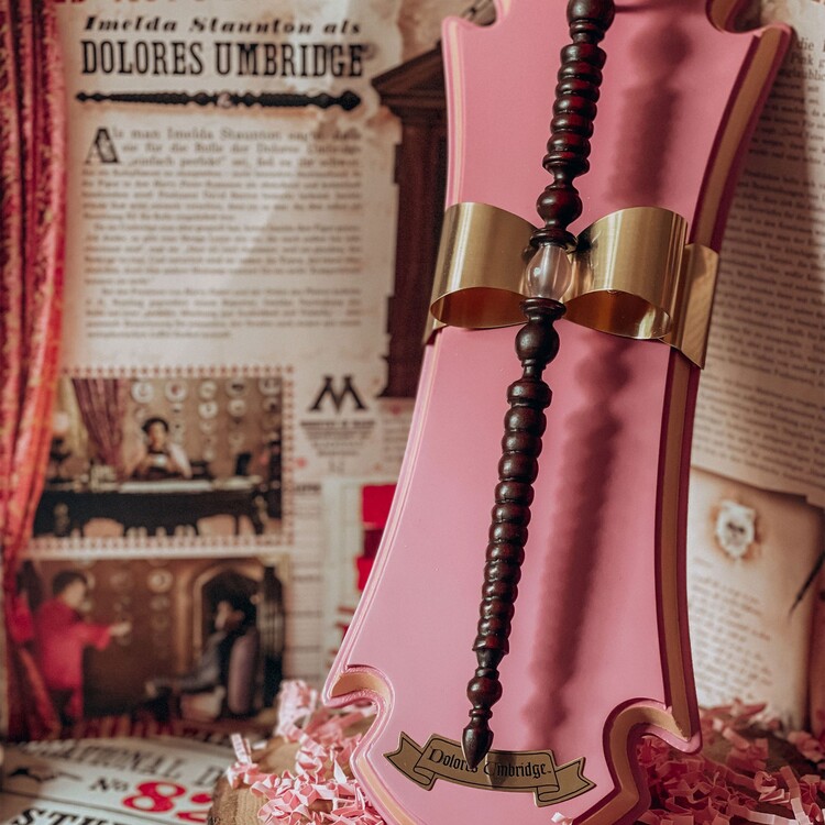 Originální licencovaná replika hůlky Dolores Umbridge o délce cca 26,5 cm s dřevěným nástěnným držákem (cca 33 x 11,5 cm). Vyrobeno z odolné pryskyřice a dřeva, ručně malované – sběratelská kvalita pro pravé fanoušky světa Harryho Pottera.