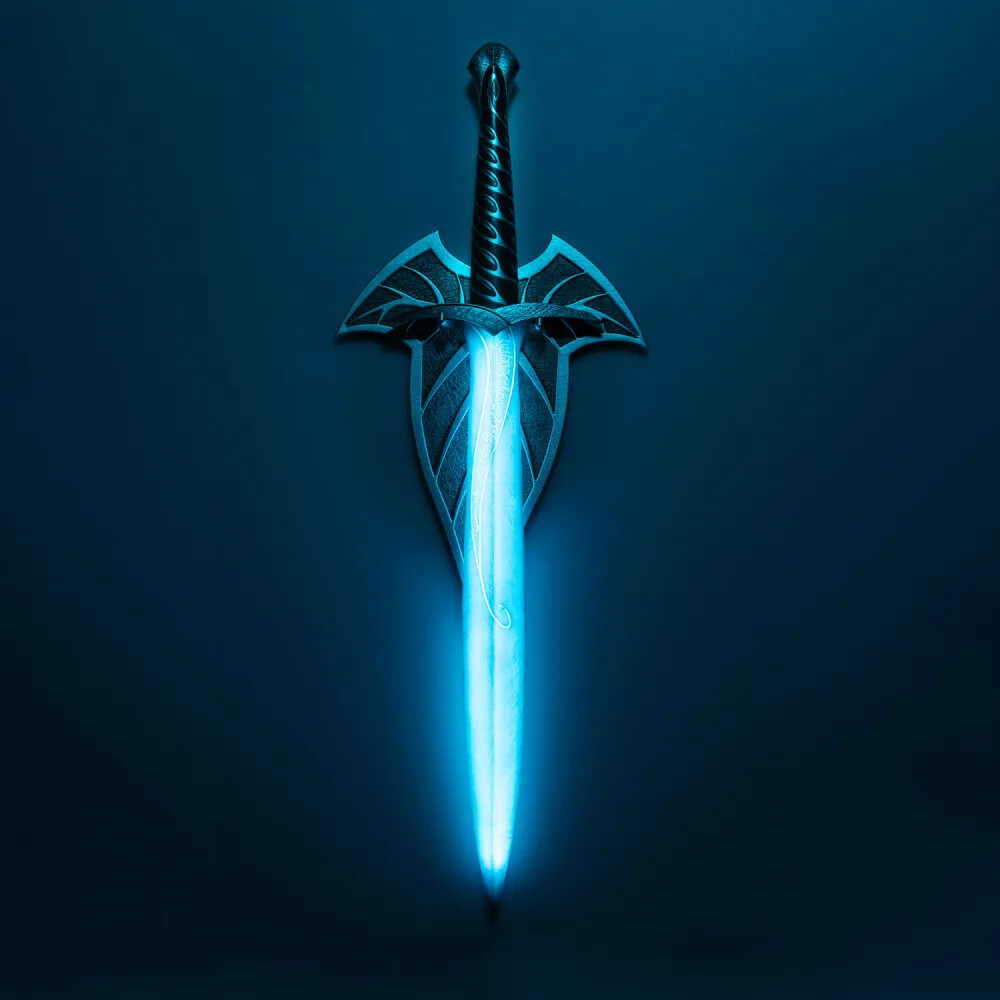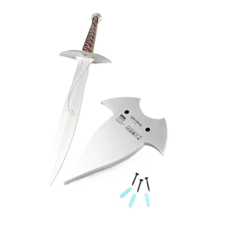 Nástěnná lampa ve tvaru Žihadla z Pána prstenů s modrým světlem ovládaným tlačítkem v rukojeti. Odolné ABS, až 4 hodiny provozu na vestavěný Li-ion 800 mAh; nabíjení odnímatelným USB-C kabelem 5 V/1 A (plné dobití až 3 h 30 min). Součástí je závěsný držák, hmoždinky a šrouby. Dýka 51 × 12,5 × 3,3 cm; držák 24,5 × 18,5 × 4,6 cm.