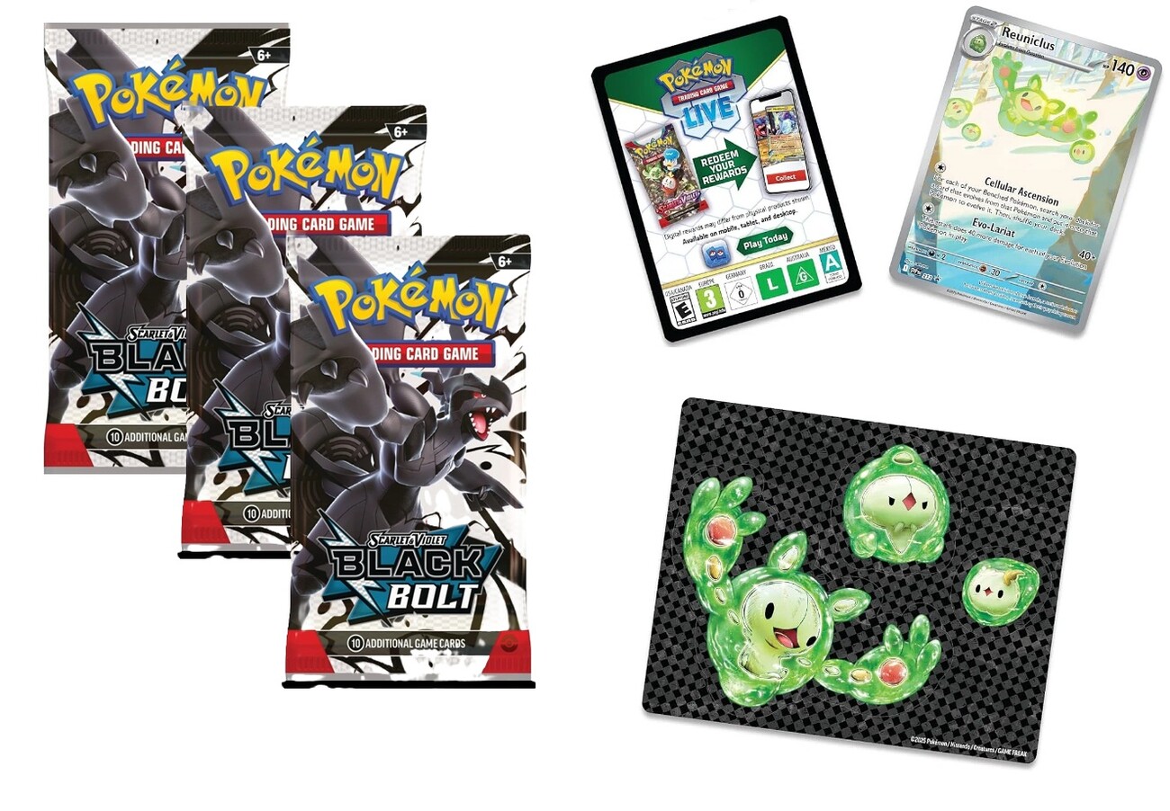 Pokémon TCG: Scarlet & Violet – SV10.5 Black Bolt Tech Sticker Collection (Reuniclus) je kompaktní sběratelská sada s foilovou promo kartou Reuniclus, archem technických samolepek, 3 boostery Black Bolt a kódem do Pokémon TCG Live. Ideální dárek i rychlý způsob, jak osvěžit balíček i binder.