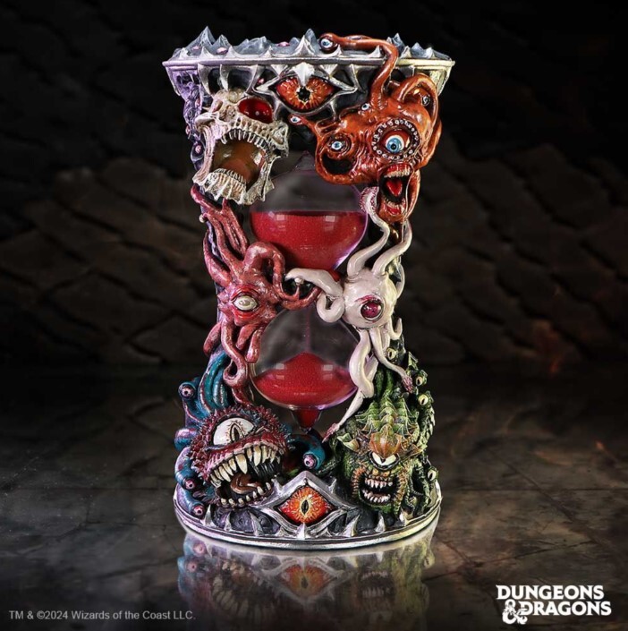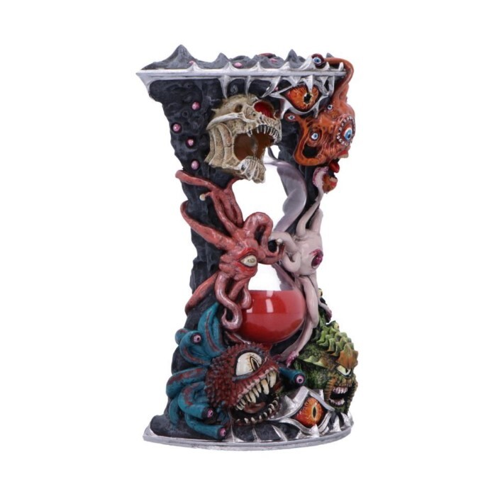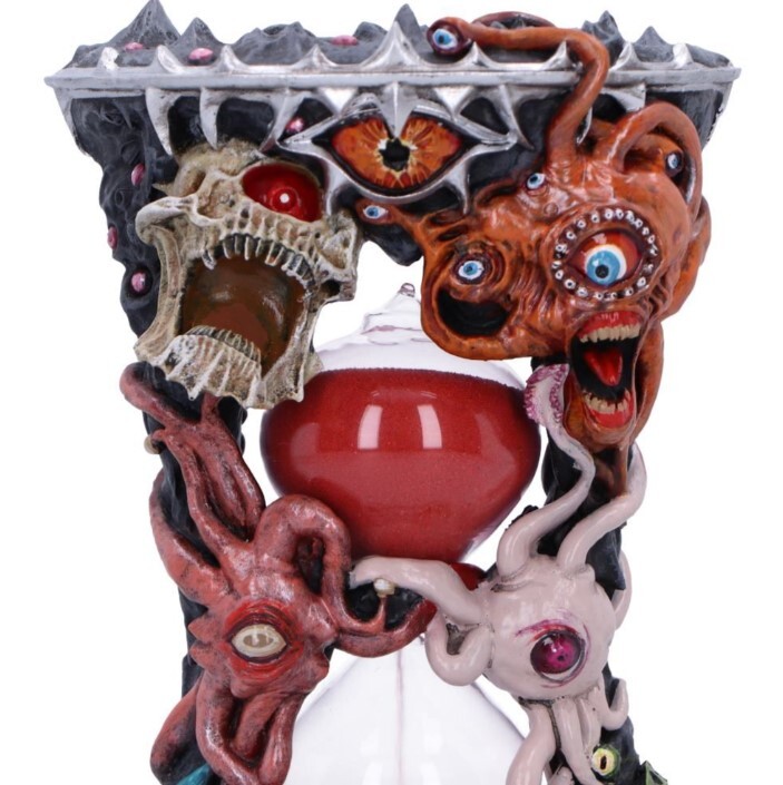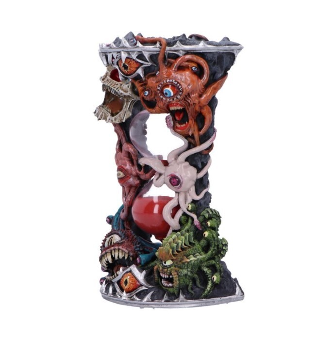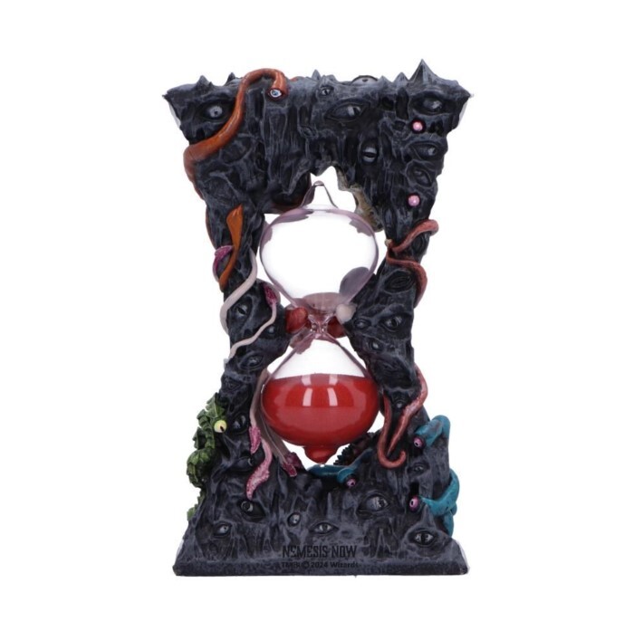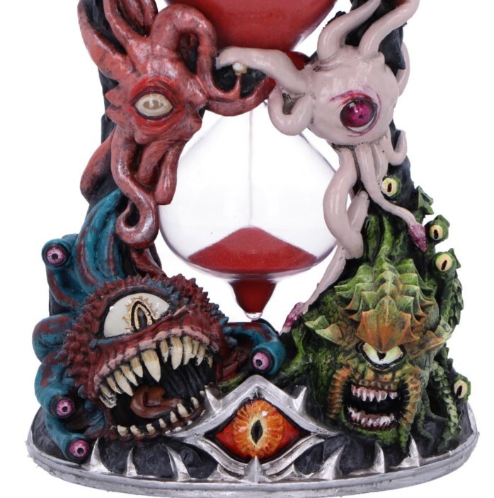 Oficiální přesýpací hodiny Beholder, ručně malované, s centrálním skleněným válcem a červeným pískem na přesně jednu minutu. Detaily očí, žilek i tesáků vyniknou na herním stole.