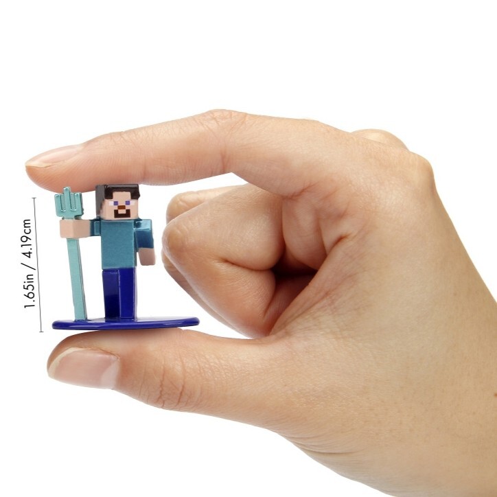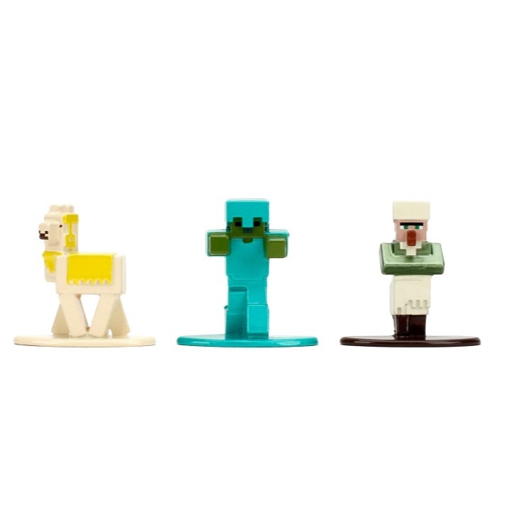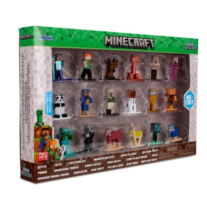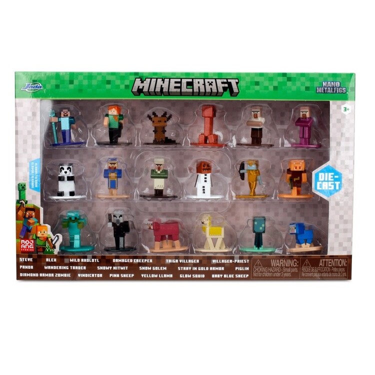 Sada 18 kovových mini figurek Minecraft (~4 cm) od Jada; oficiální licence, dostatečně odolné pro běžné zacházení a připravené k vystavení na stůl či poličku; vhodné od 3 let.