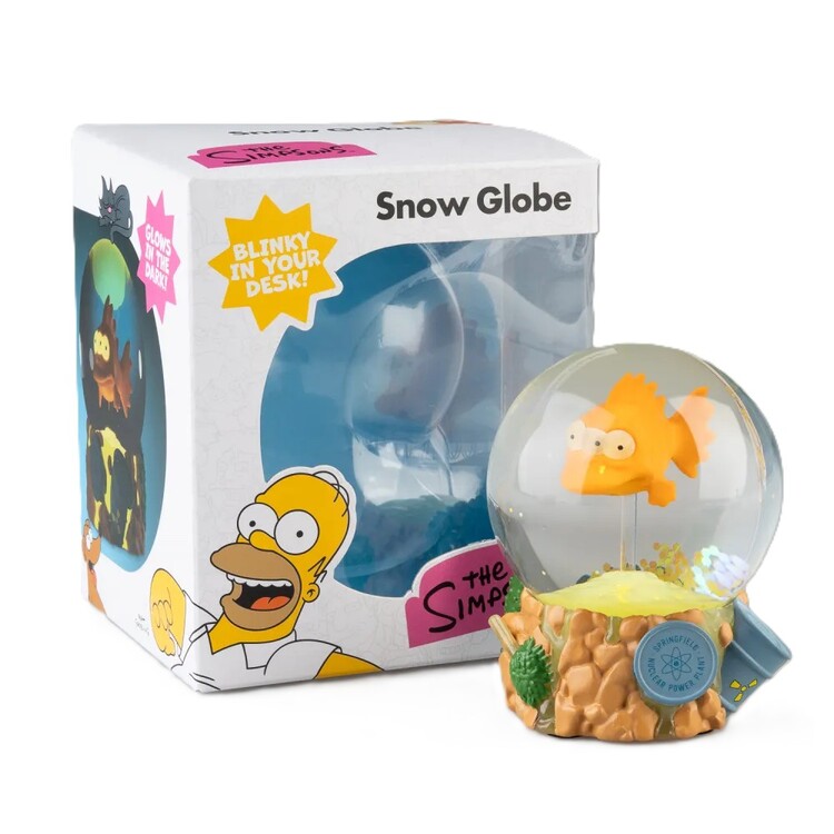 Sněhový glóbus s legendární tříokou rybou Blinky ze Simpsonových. Nejen že skvěle vypadá na poličce – díky luminiscenční barvě navíc ve tmě ožívá a září.