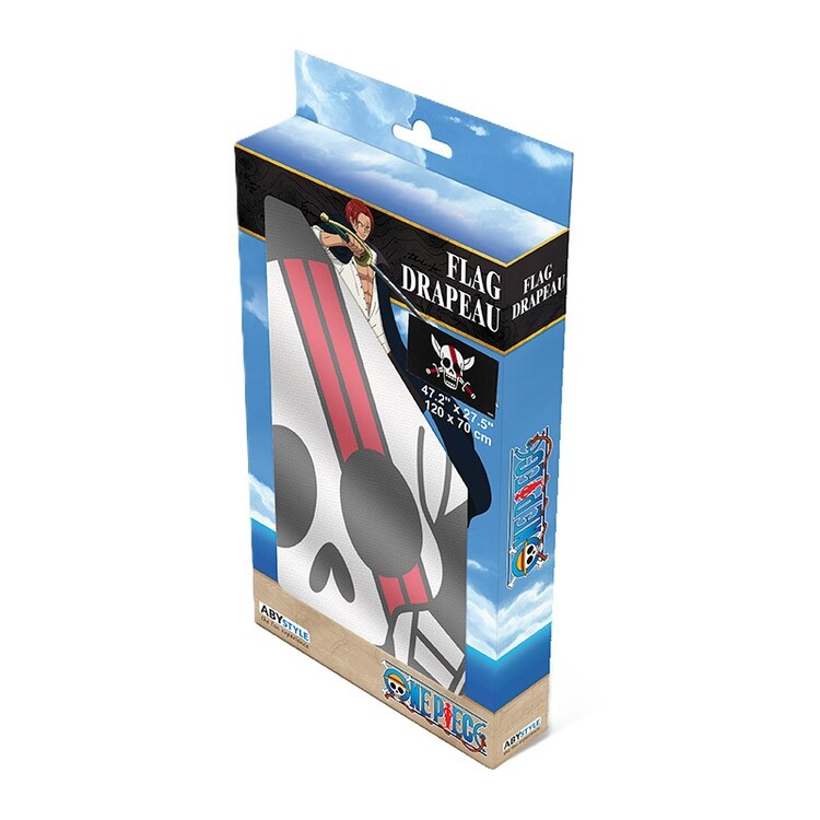 Vlajka posádky Rudovlasého Shankse ze světa One Piece s oboustranným potiskem. Pratelná v pračce, ideální do pokoje, na fanouškovské akce i do vitríny.
