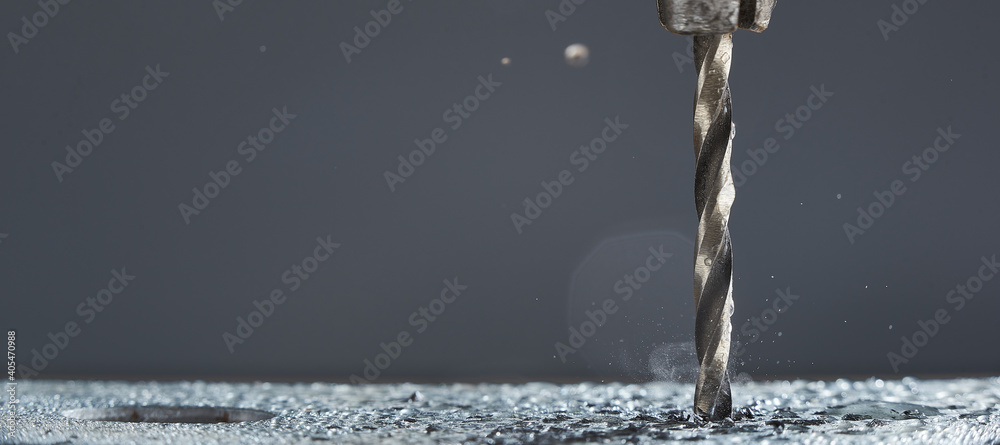 Fotografie Metal wet drill bit make holes in metal billet on industrial drilling machine with shavings on gray background