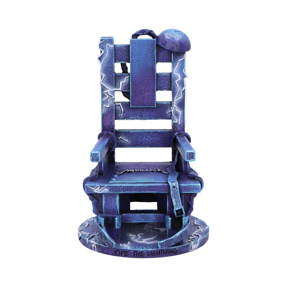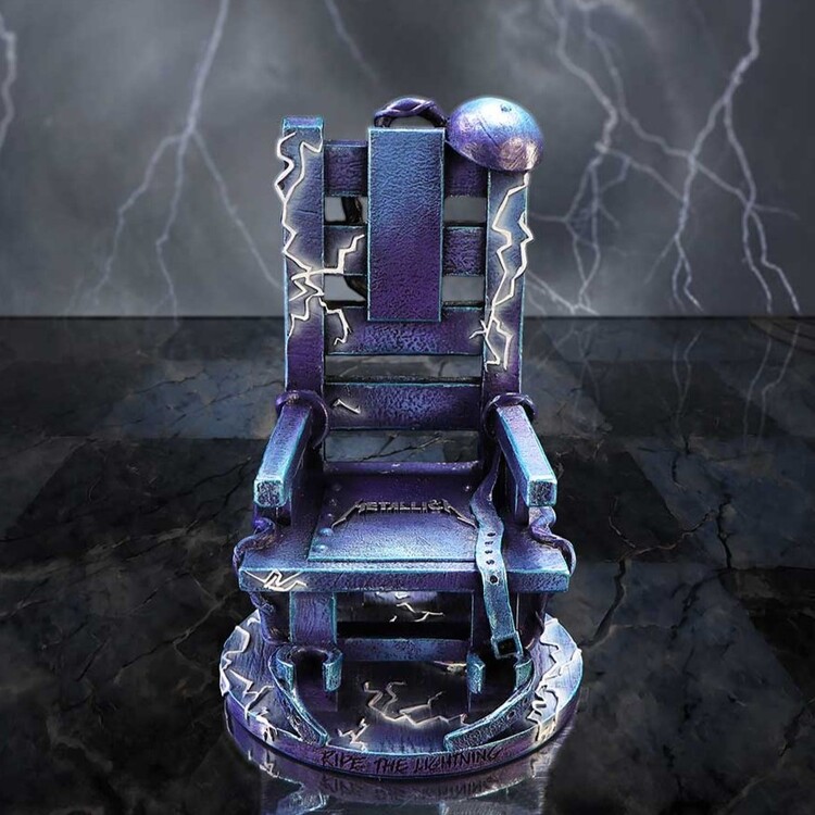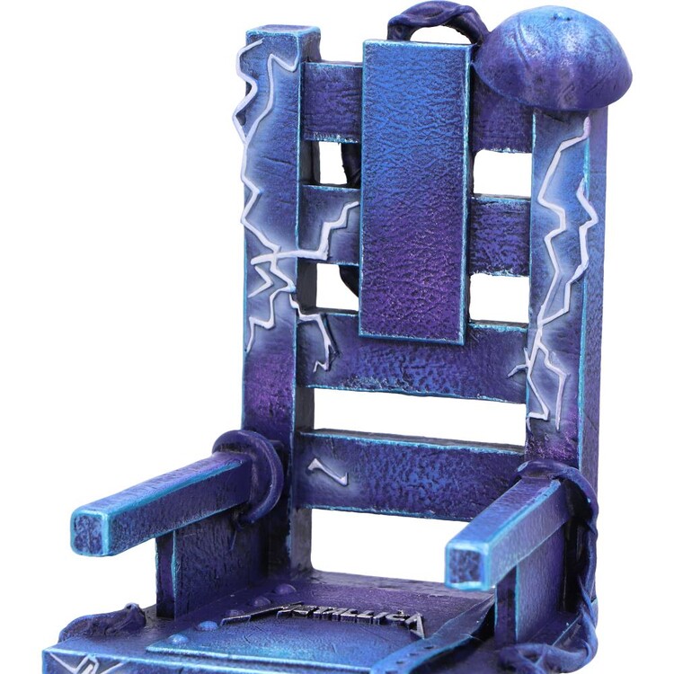 Oficiální dekorace Metallica, ručně malovaná, s modrým elektrickým křeslem, logem kapely a blesky. Dodává se v dárkové krabičce Metallica.