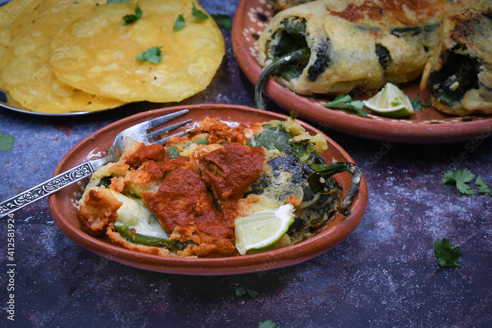Fotografie Mexican chiles rellenos stuffed with potato and cheese, vegan batter, served in