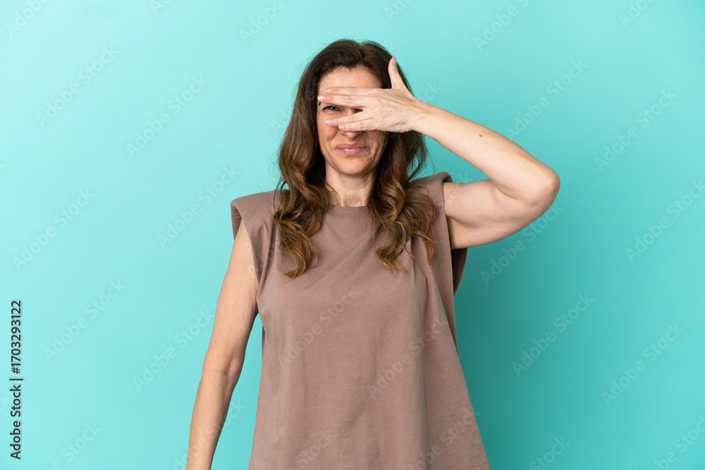 Fotografie Middle aged caucasian woman isolated on blue background covering eyes by hands a