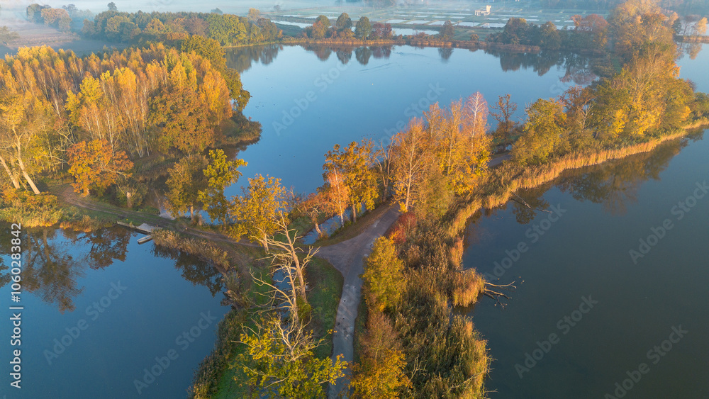 Fotografie Milickie Ponds at sunrise, bird's eye view, Lower Silesian Voivodeship, Poland