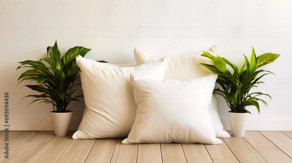 Fotografie Minimalist Home Decor with Pristine White Pillows and Vibrant Potted Peace Lilie