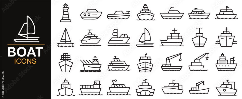 Obraz na plátně Minimalistic nautical-themed icons depicting ships, yachts, sailboats, and a lighthouse in simple line style