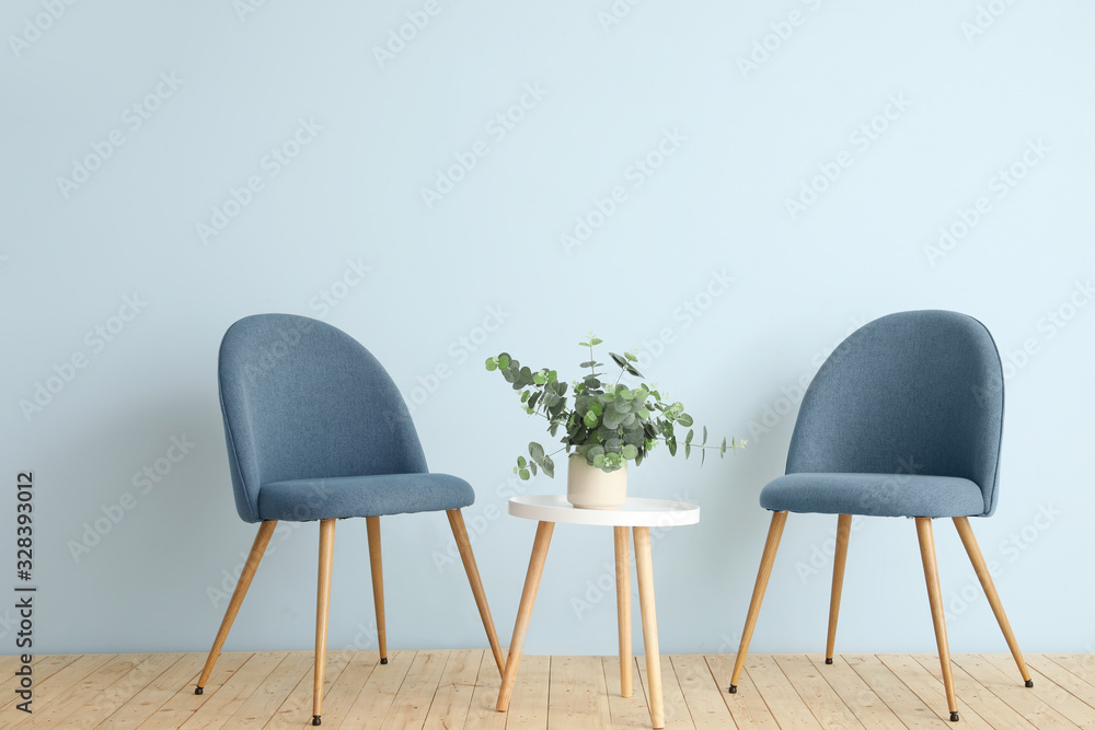 Fotografie Modern chairs and table near color wall