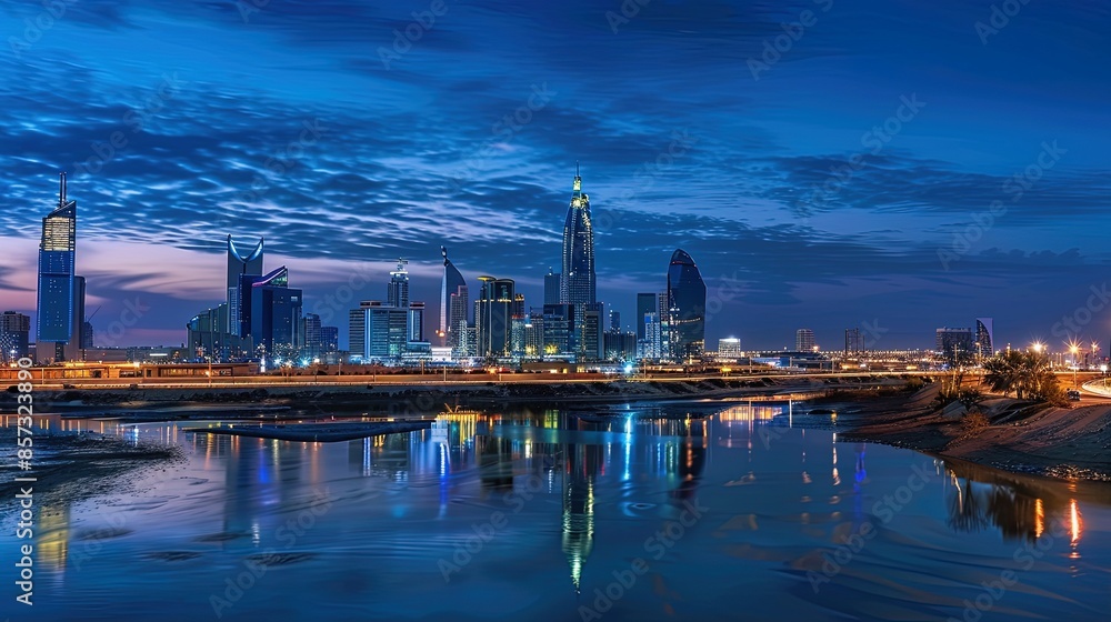 Fotografie Modern cityscape of kuwait city reflecting on calm water at dusk