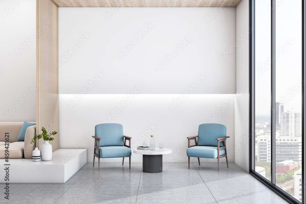 Fotografie Modern wooden and concrete office interior lobby with cozy seats, empty mock up place and city view