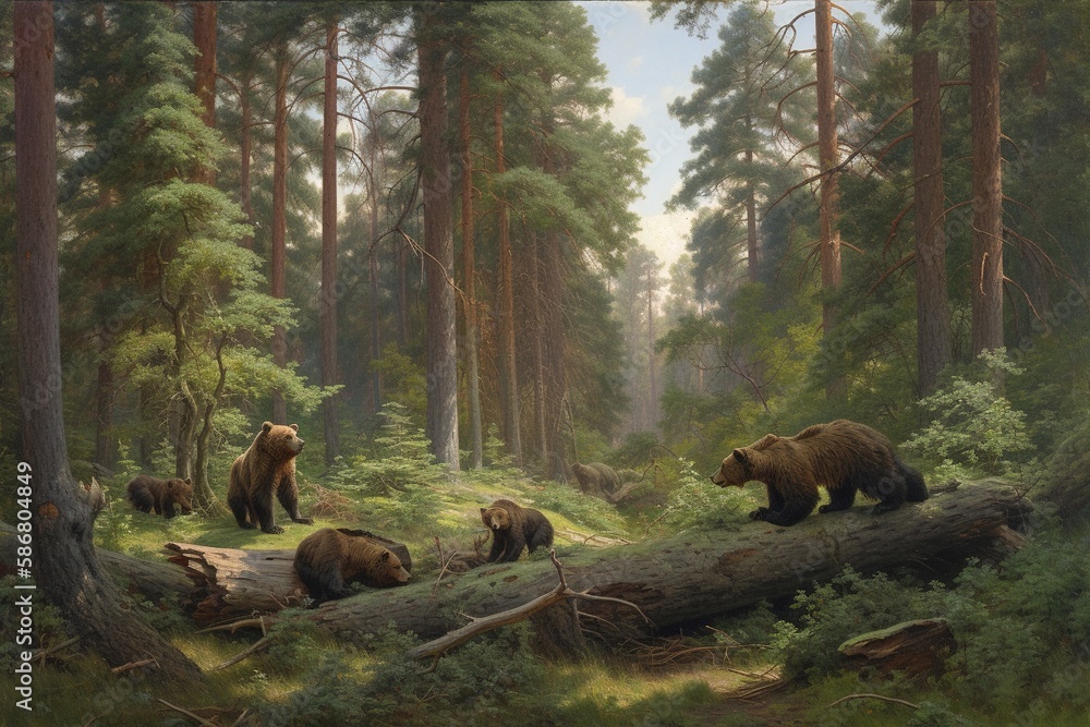 Fotografie Morning in a pine forest with brown bears. Generative AI.