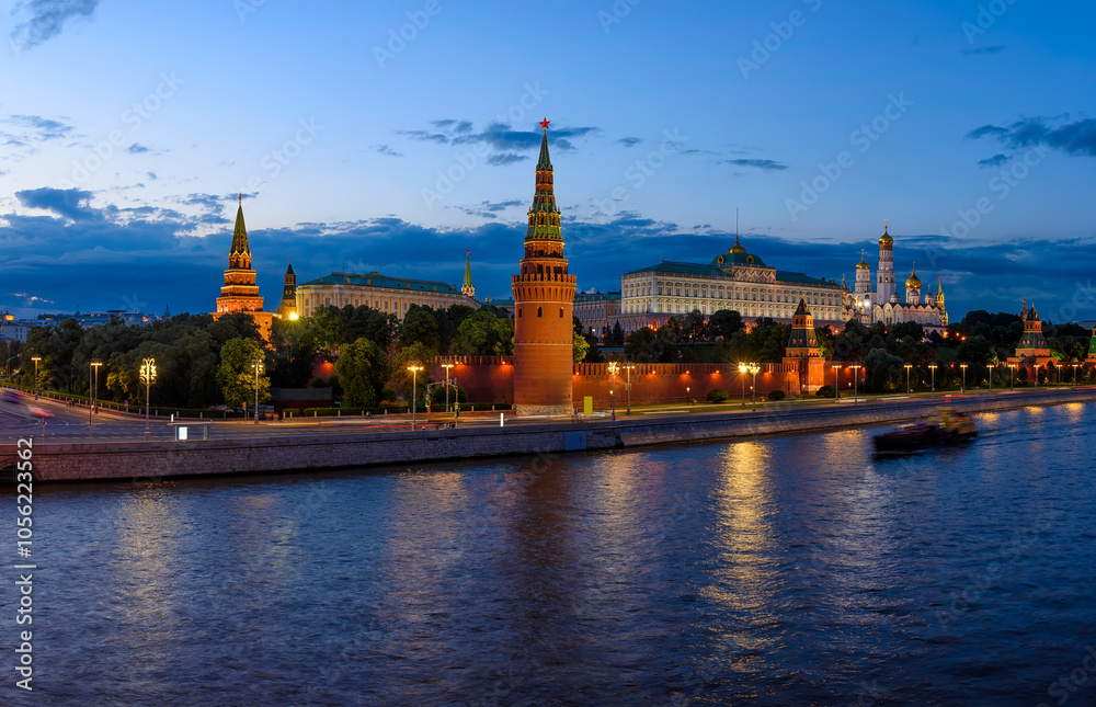 Fotografie Moscow Kremlin, Kremlin Embankment and Moscow River at night in Moscow, Russia