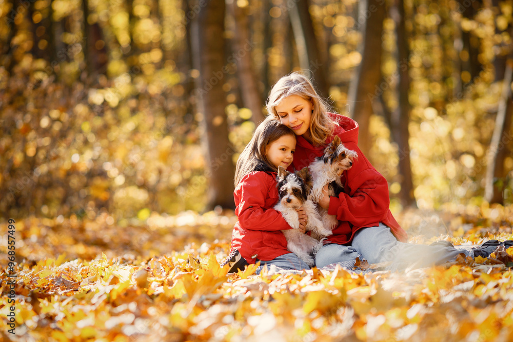 Fotografie Mother and daughter sitting on a blanket in autumn forest with dogs
