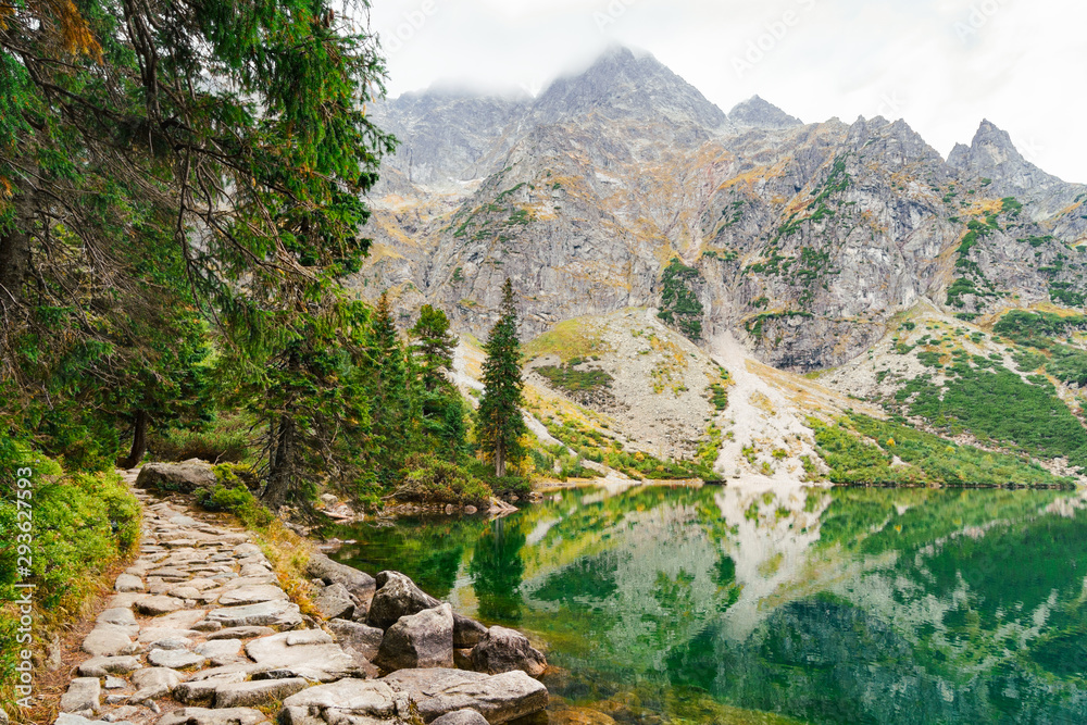 Fotografie Mountain landscape with hiking trail and wonderful view of Morskie Oko (Sea Eye) lake