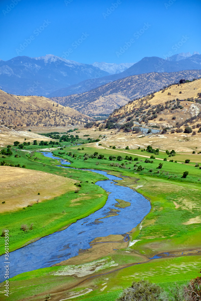 Fotografie Mountain river valley landscape. River valley in mountains.