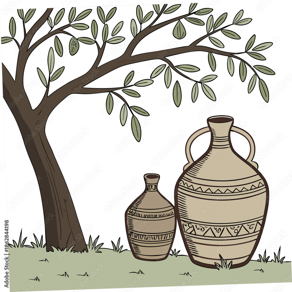 Fotografie Mud pitchers under tree grass clay jugs handles