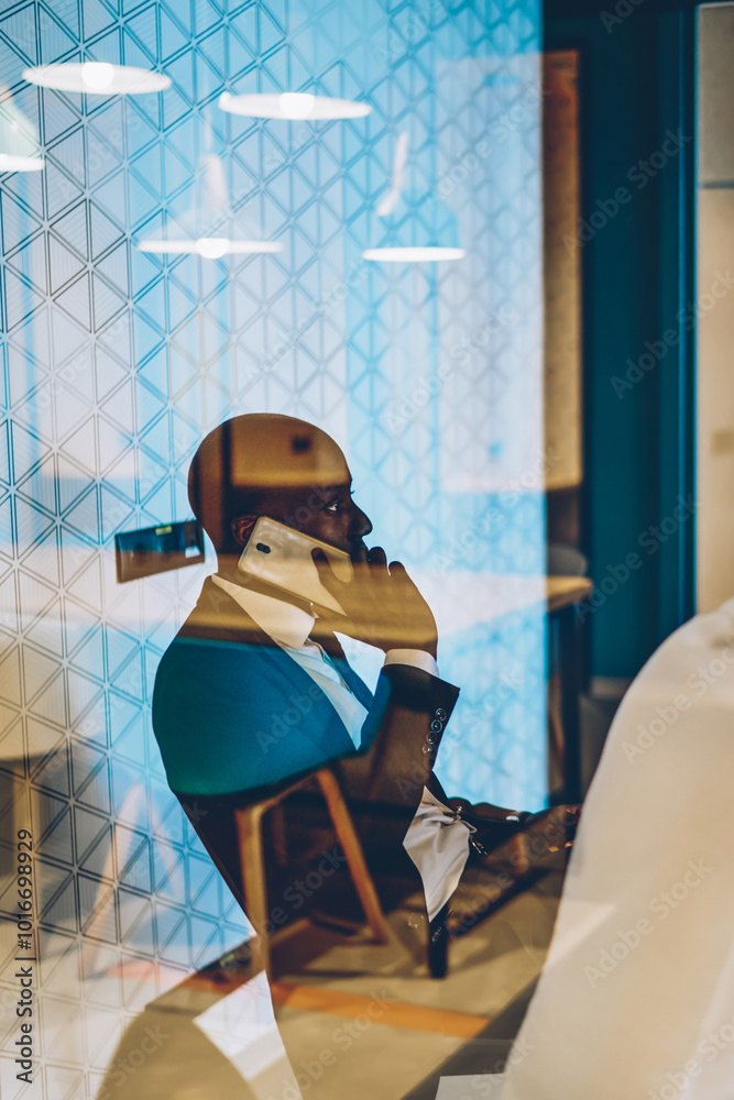 Fotografie Multicultural group entrepreneurs discussing plan of cooperation sitting at table behind glass wall of meeting room
