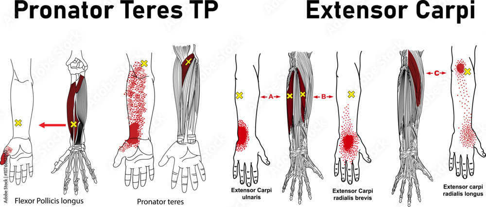 Fotografie Myofascial Trigger Point, Pronator Teres TP, Extensor carpi