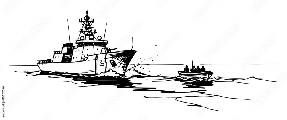 Fotografie navy warship intercepting boat at sea sketch vector