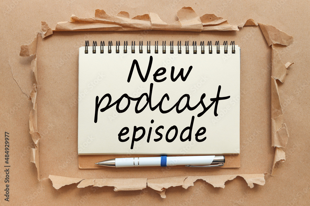 Fotografie new podcast episode open notepad with text on torn paper background