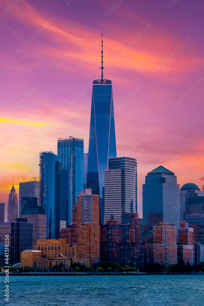 Obraz na plátně New York City Manhattan downtown skyline at dusk with skyscrapers over Hudson Ri