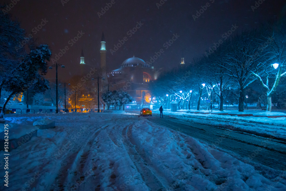 Fotografie Night snow view of Hagia Sophia and its surroundings