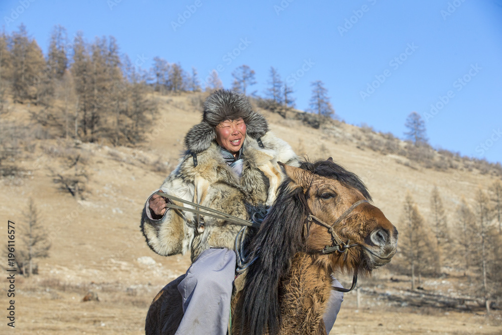 Fotografie nomad man wearing a wolf skin jacket, riding his horse in a steppe in Northern M