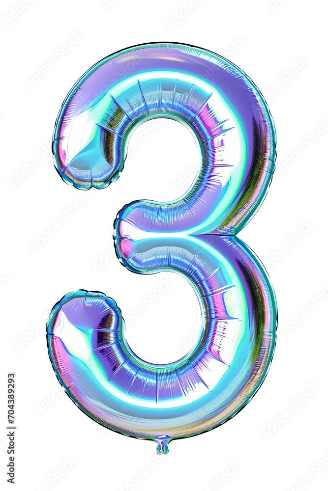 Fotografie number 3 iridescent mylar helium balloons on transparent background,colorful b