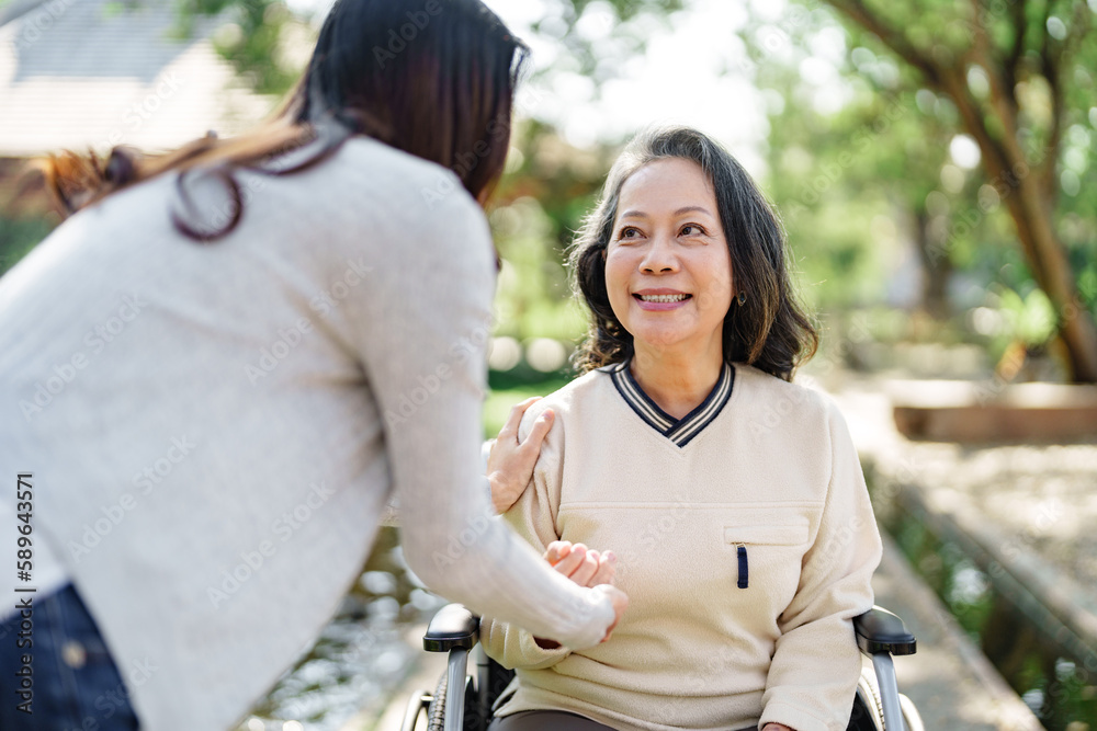 Fotografie Nursing home, Young caregiver helping senior woman in wheelchair, Volunteer