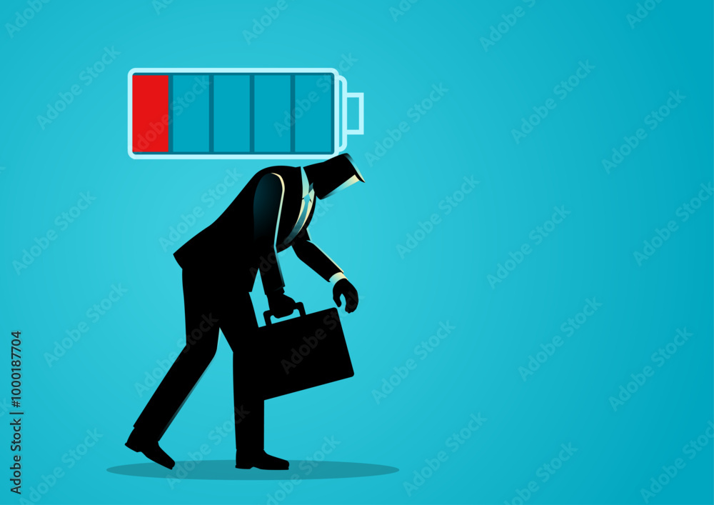 Obraz na plátně Businessman walking weary, carrying a briefcase with a low battery icon, represe