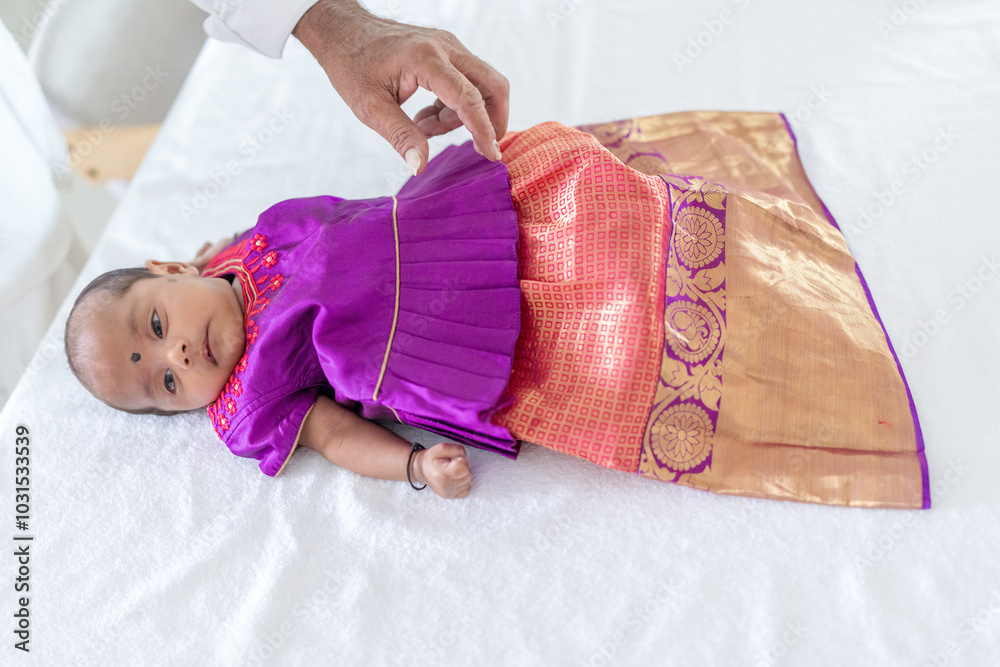 Obraz na plátně ndian family spending time together, wearing traditional and casual outfits with a baby, a young girl, and grandparents in a high-rise apartment in Kuala Lumpur, Malaysia