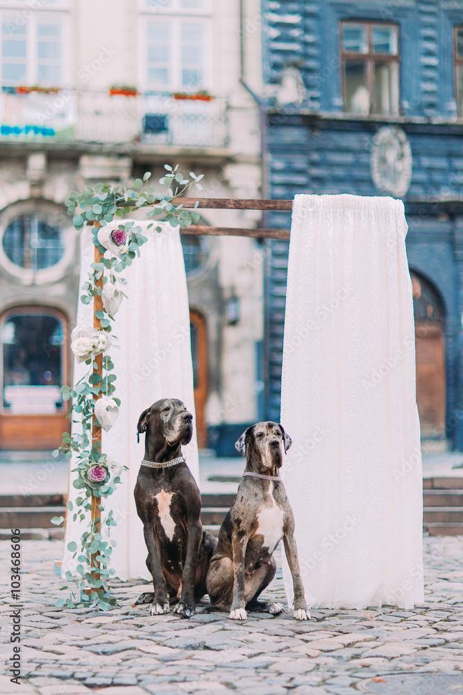 Obraz na plátně Two purebred dogs near the vintage wedding arch in Lviv city centre