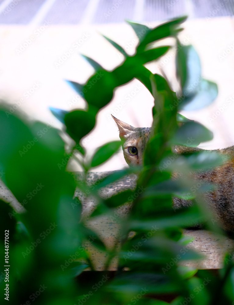 Obraz na plátně Candid photo of a feral cat's eyes interspersed between blurry leaves foreground
