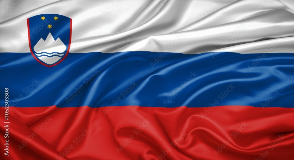 Obraz na plátně Slovenian national flag with crest waving in detail.