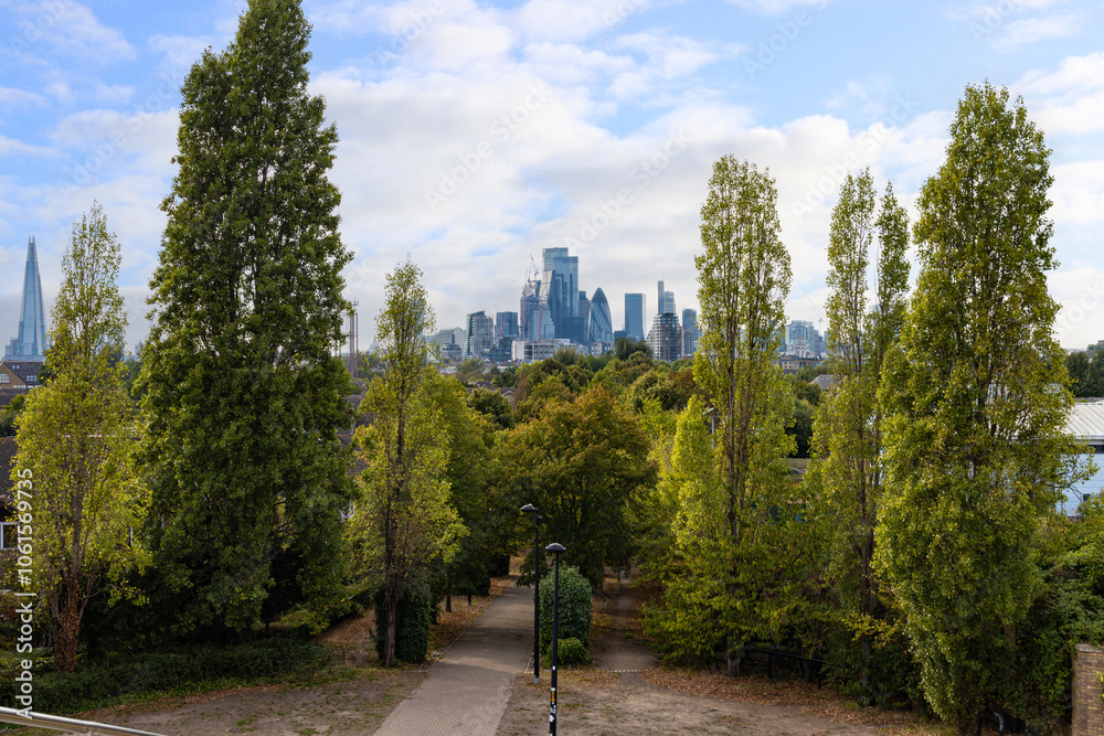 Obraz na plátně Tall trees in a London park blending in with the City of London skyscrapers