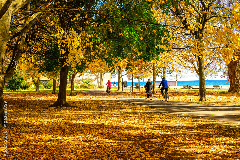 Obraz na plátně Cyclists on bike path under fall color on a sunny afternoon at Kew Beach on the