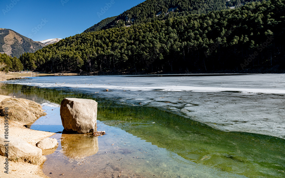 Obraz na plátně Paisaje del lago de Engolasteis en Encamp , por el camino de las Pardinas