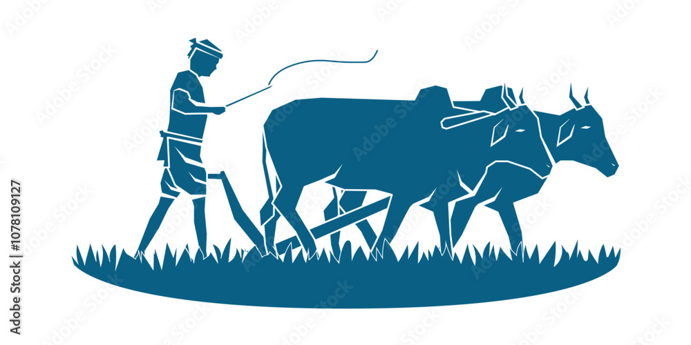 Obraz na plátně Vector illustration of farmer ploughing with bullocks on transparent background