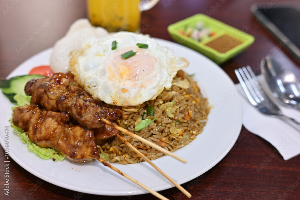 Obraz na plátně Indonesian fried rice with chicken satay and sunny side up egg on top