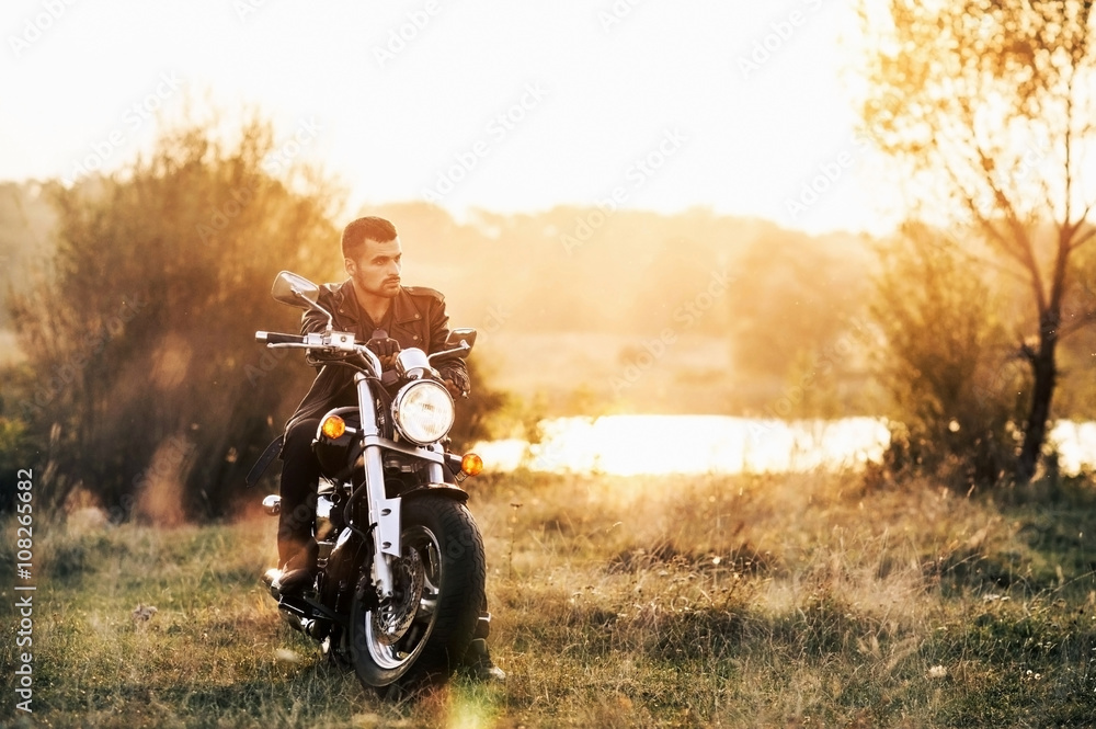 Obraz na plátně young brutal man in a black jacket and glasses sits near a motorcycle